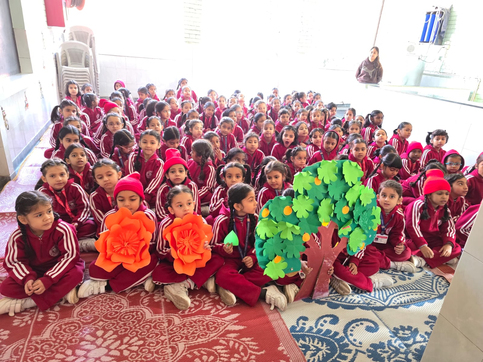 The story "The Little Seed" was enacted by teachers using vibrant props, including colorful flowers, trees, and leaves.